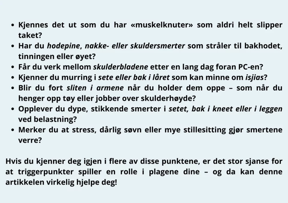 Mange beskriver «muskelknuter» – små, ømme punkter som både kan gjøre vondt lokalt og sende smerter til andre steder i kroppen. De oppstår ofte ved langvarig spenning, overbelastning eller mye stillesitting, og kan bidra til hodepine samt nakke‑, skulder‑, rygg‑ og setesmerter. I denne artikkelen får du en enkel forklaring på hva triggerpunkter er, hvordan de kjennes ut i ulike muskelgrupper, og hvorfor vi behandler dem slik vi gjør.