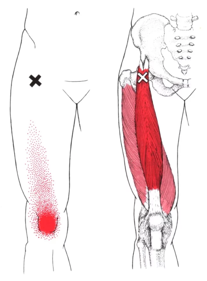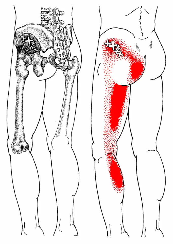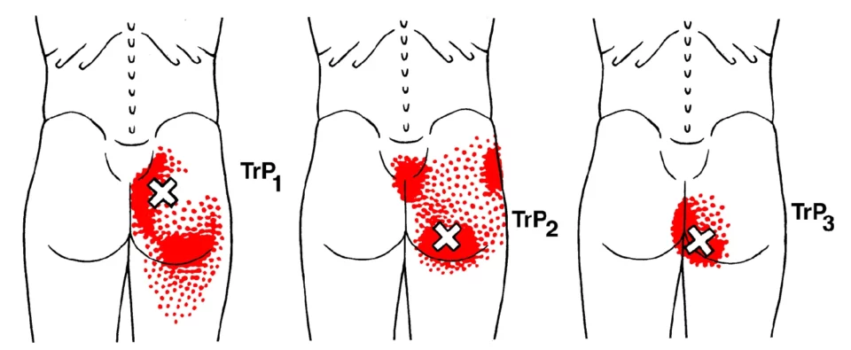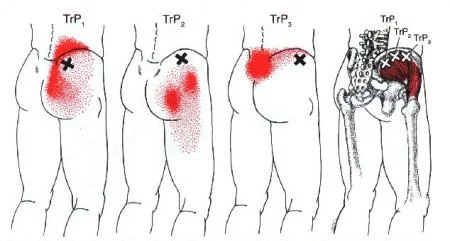 På illustrasjoner av triggerpunkter er det ofte markert små «X» der selve triggerpunktet ligger i muskelen. Fargenede røde områder viser hvor smerten typisk kjennes (referert smerte). Jo mørkere rødfarge, desto vanligere er det at pasienter rapporterer smerte akkurat i dette området.